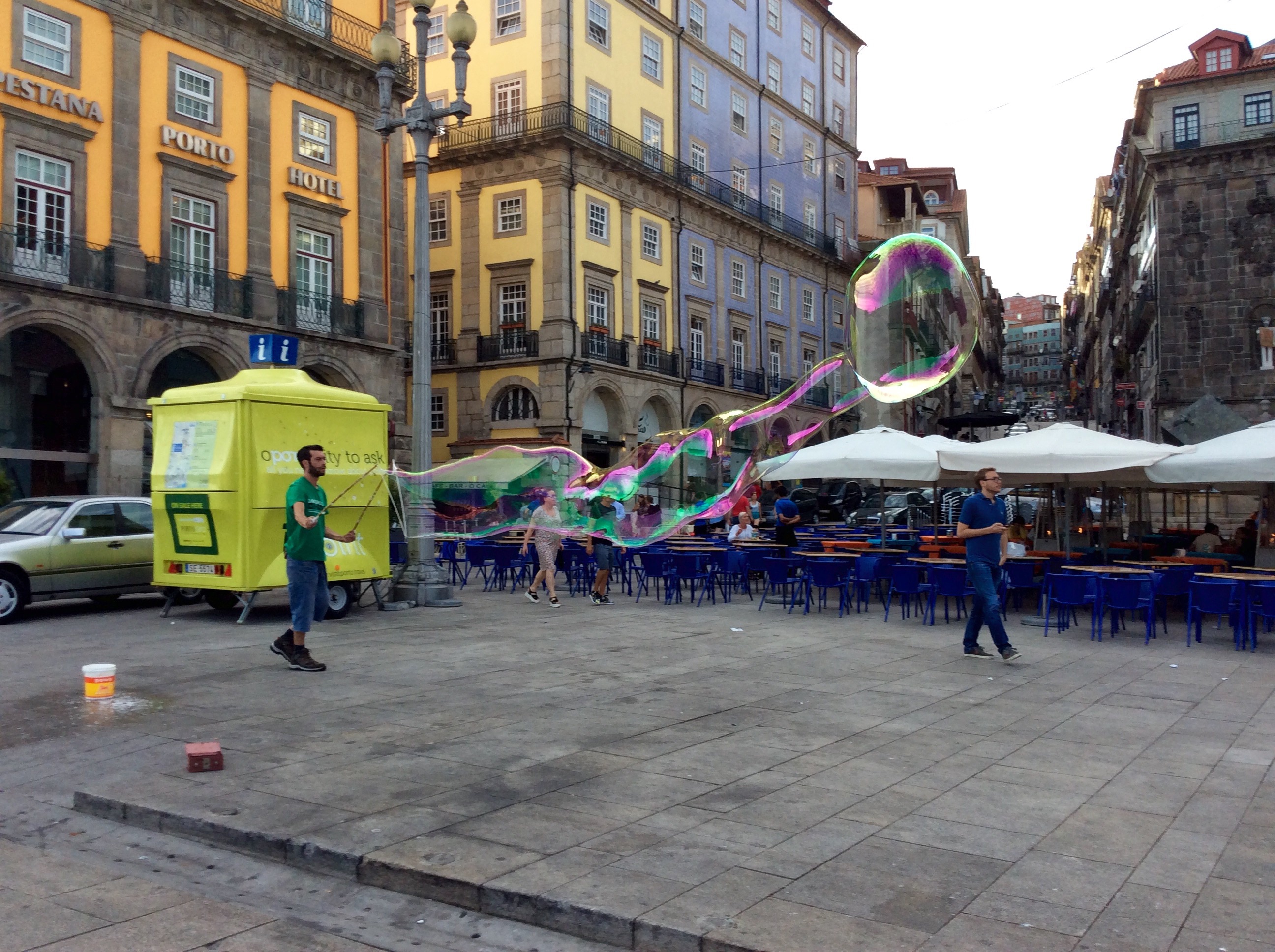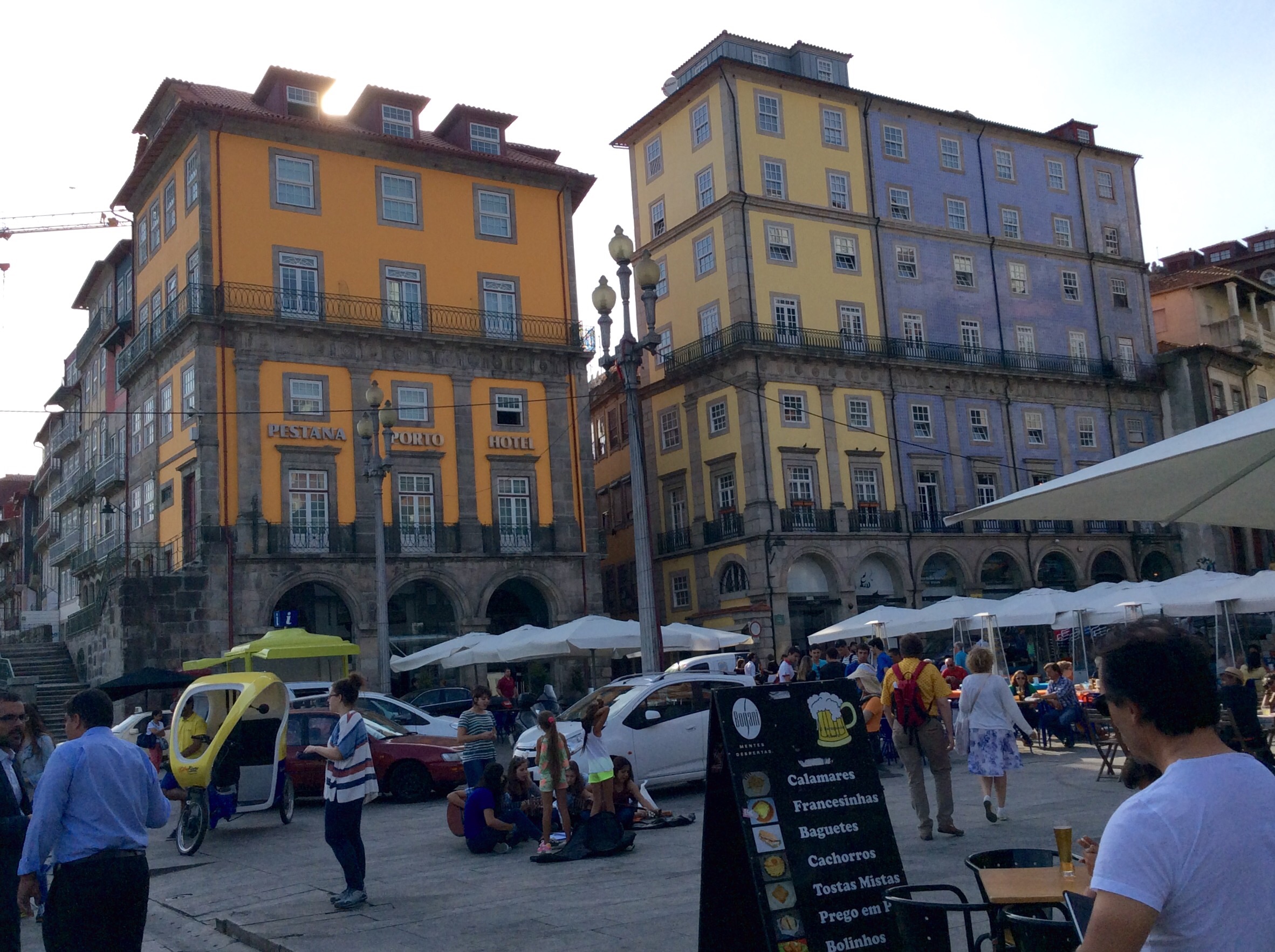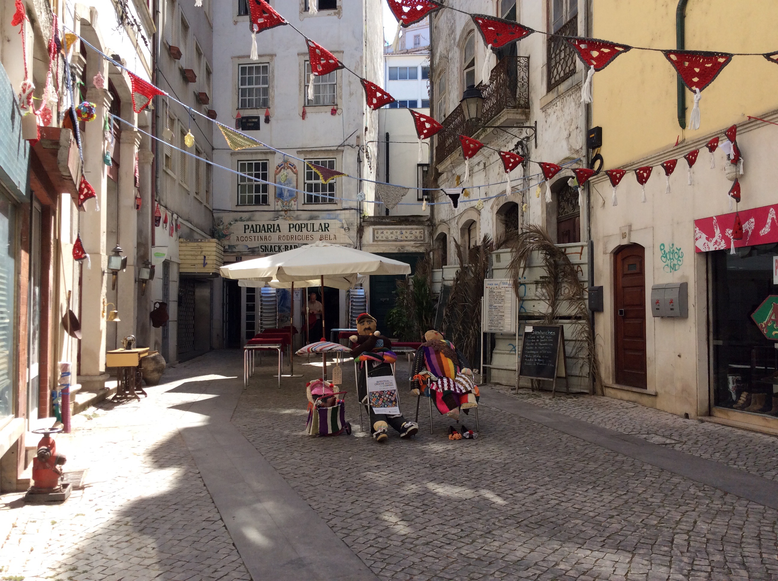 Friday was another easy ride, except when Gabriel wiped out on his bike. But he’s fine, especially after being sweetly attended to by the pretty lady at the pharmacy in Lisbon who cleaned up the cut on his arm herself. Our last ride was mostly all along the ocean. It was flat! We got here in 2 hours. Lisbon is fun and bustling. Dennis Singletary flew in from Spain and met us for dinner at a restaurant called Fartas Brutas. (Brutal Farts). Now THAT’S a friend! And such a fun end to our trip. Oh, another thing I’ve learned. When the restaurant owner offers you that second complimentary glass of port after the meal: you CAN politely decline.And you should. You really probably should. This morning (Gabriel’s birthday), after several rousing cups of coffee, Gabriel got up and disassembled our bikes in preparation for our flight back to Barcelona tomorrow. Had to do it out on the street in the plaza cos there was no room in the hotel. That was yet another attraction for tourists to photograph apparently. Then we