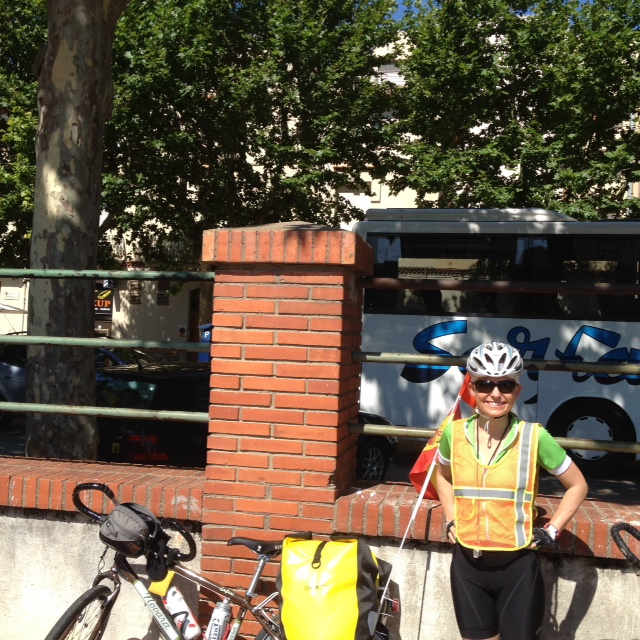It was blazing hot when we arrived at the dusty train station / Eurocar rental place in Figureres. We heaved our bikes out of the back of the rental car, locked the tightly packed lemon-yellow paneers (saddle bags) onto the sides of the bikes, and strapped our helmets to our heads. A beer-induced enthusiasm the night of Spain’s Eurocup win had inspired us to tie tall, plastic red and yellow Spanish flags to the back of our bikes and now they were snapping loudly in the hot, dry wind. Gabriel also suggested I don a safety-orange reflective vest over my lime-green bicycle shirt, and it being the first day and both of us a bit nervous about cars, etc., I conceded. Figueres is home to the biggest Salvador Dali museum in the world, which we had spent a whole day exploring last summer. This year, day-glo and flags a-flying, treacherously maneuvering through traffic in the congested city, we looked like an escaped exhibit. As I watched Gabriel swerve to miss hitting an old man who stepped out of a doorway, I thought: What in the hell are we doing?