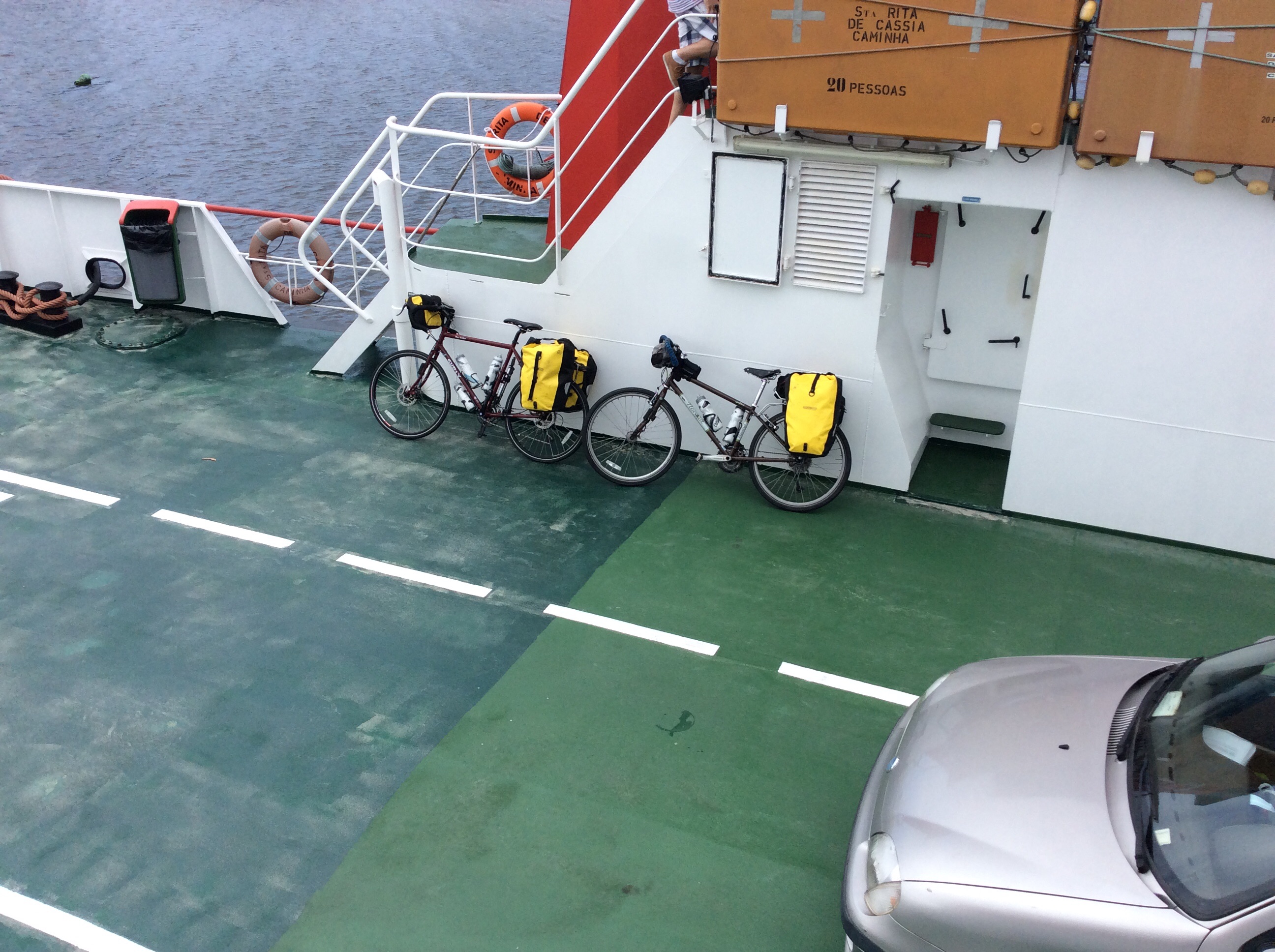 It was hard to leave the beautiful fortress on the hill this morning, it really was. And hard as we try, we can’t seem to get going before almost 10. The last 3 hotels have had some killer breakfast buffets with all kinds of fruit and fresh croissants. We finally took off and rode right along the ocean, heading south, and I got to watch the waves crashing against the rocks, and look up at the cloud formations. The ride was flat. It really was. There was a headwind though, so there was a workout element and the smell of the ocean was blowing right into my nose. I didn’t mind that. We covered 35 km at a reasonable pace. A German Shepard was my Animal Totem. I’ve seen at least one German Shepard per day here, usually more, that is THE dog of choice in these parts. We stopped at one bar where naturally everyone there got into an animated discussion about dock location and ferry times to Portugal. We found our ferry stop around 12 noon and by 1pm we were in Portugal and splitting a sandwich in an outdoor cafe. The vibe here is Spanish-like, but different. I can’t put my finger on a description of it yet. I think they talk even faster and the architecture is more clustered. We got back on the bikes because we had another 21 kilometers to get to Viana Do Castelo. The headwind was now hard going. It felt like someone was pressing their hand against my forehead as I rode. I put on my jacket, because it was overcast and chilly even though we were riding hard. It was kind of like having a fever– when you’re cold but also sweating down your back. The road